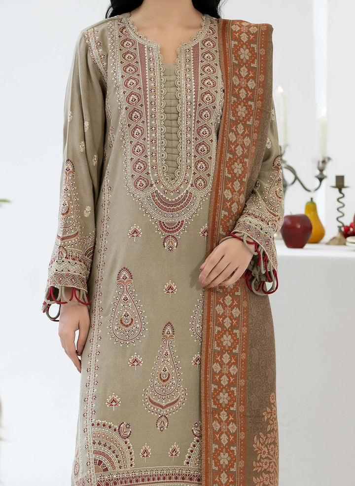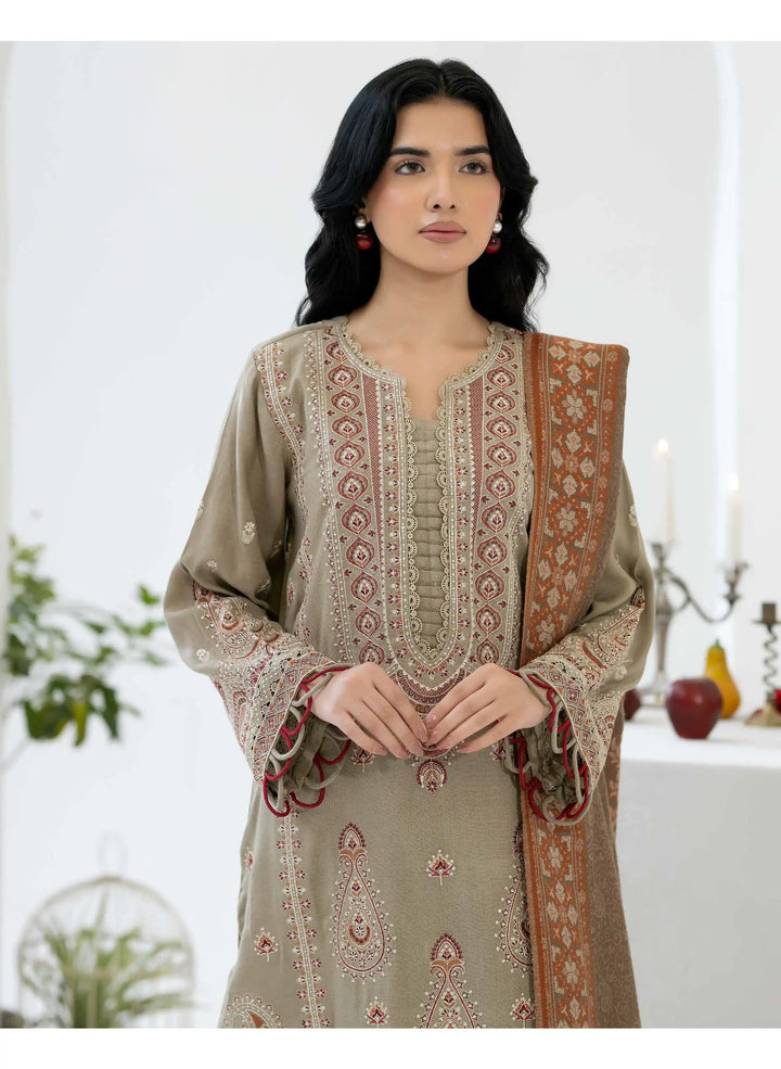 Immerse yourself in timeless sophistication with Johra Zeina, a masterpiece from Johra’s luxurious winter collection. Crafted from premium peach leather fabric, this embroidered ensemble exudes regal elegance with intricate threadwork that highlights refined artistry and grace.